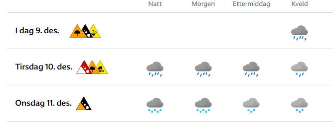 I dag: Kraftige vindkast (gult nivå), flomfare (gult nivå), jord-, sørpe- og flomskredfare (gult nivå), svært mye regn (oransje nivå) og betydelig snøskredfare (oransje nivå).