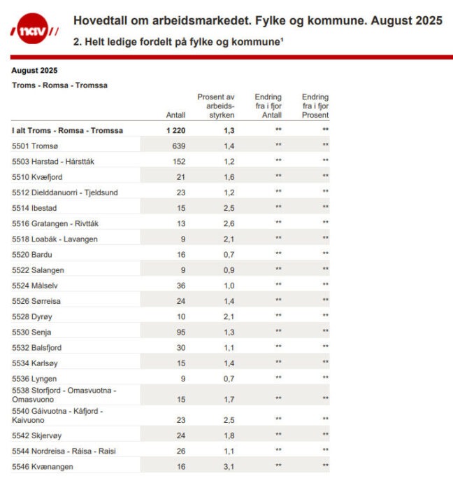 For august 2025 har NAV registrert 15 helt ledige på arbeidsmarkedet i Storfjord kommune. Dette utgjør 1,7% av den totale arbeidsstyrken.