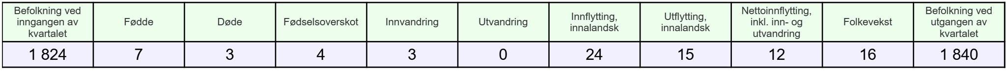 Ved inngangen til andre kvartal 2025 hadde Storfjord 1 824 innbyggere, og ved utgangen- 1 840. Det vil si en befolkningsvekst på 16. Tallene fordeler seg slik (klikk for større bilder):