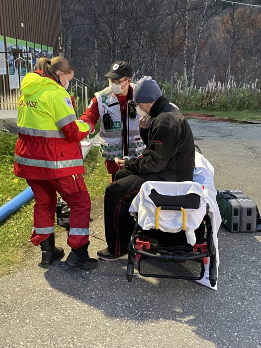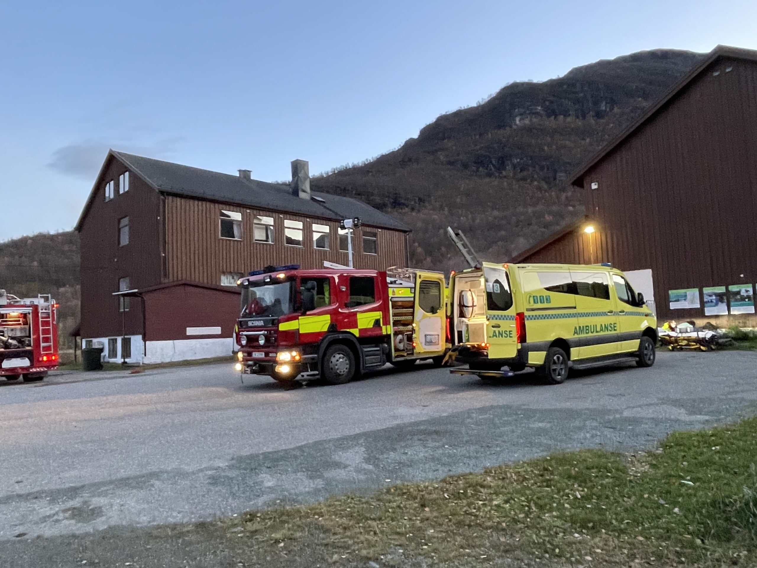 Brannmannskap fra Storfjord og Lyngen, samt ambulansetjenesten i aksjon på brannøvelse på Vestersiasentret – Foto: Kåre Eriksen