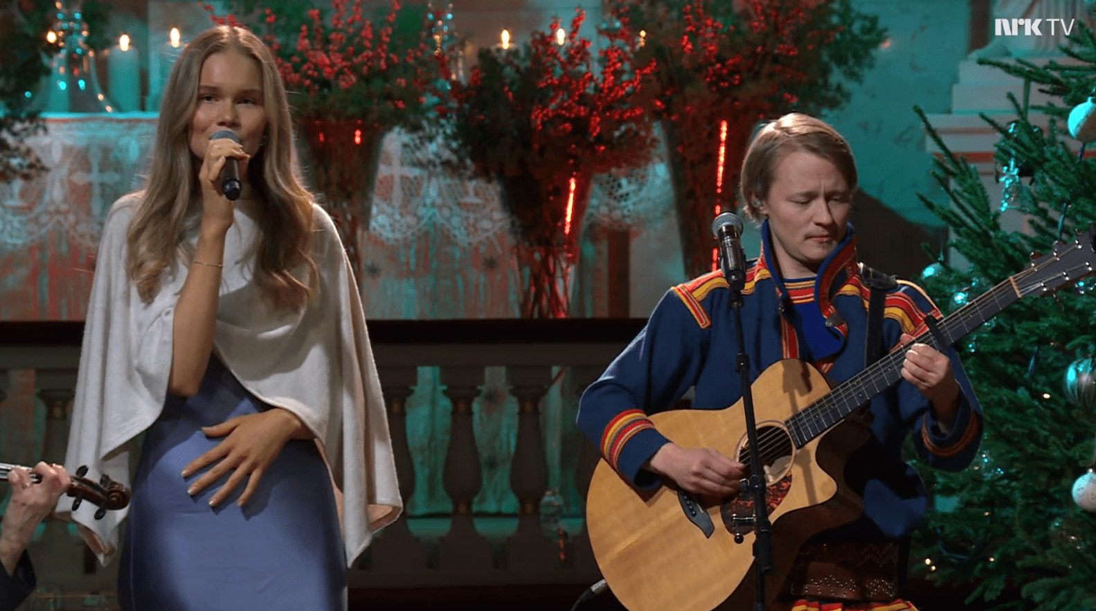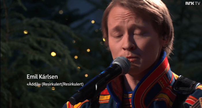 Først synger de «Glade jul» sammen på finsk og samisk. Dernest joiker Emil «Addjà».
