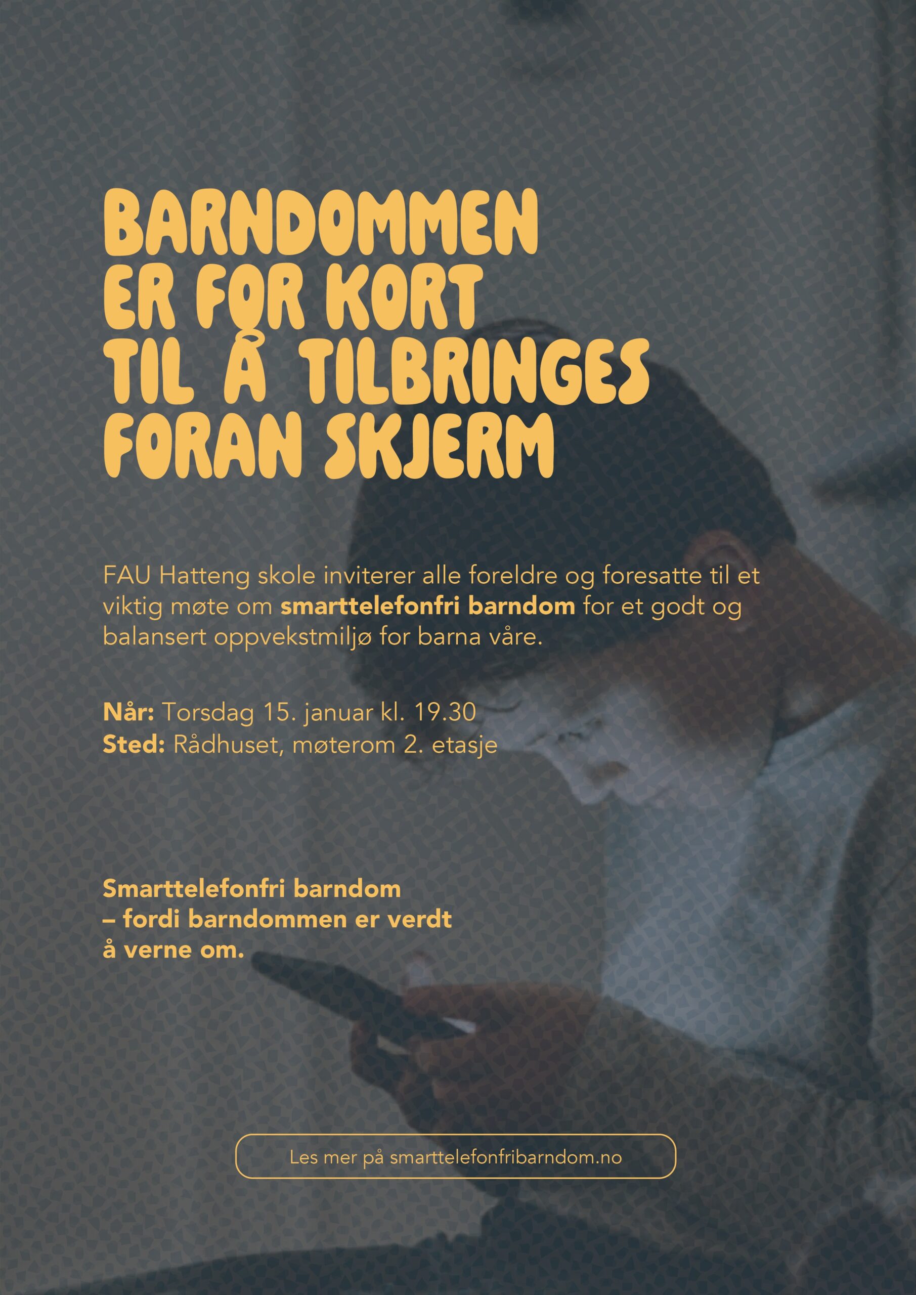 Hensikten med møtet er å ta opp problemstillinger knyttet til barn, smarttelefoner og skjermbruk, basert på initiativet Smarttelefonfri Barndom. Møtet vil gi informasjon og rom for diskusjon og dele refleksjoner. Målet er at vi kan skape gode og balanserte oppvekstmiljø for barna våre!